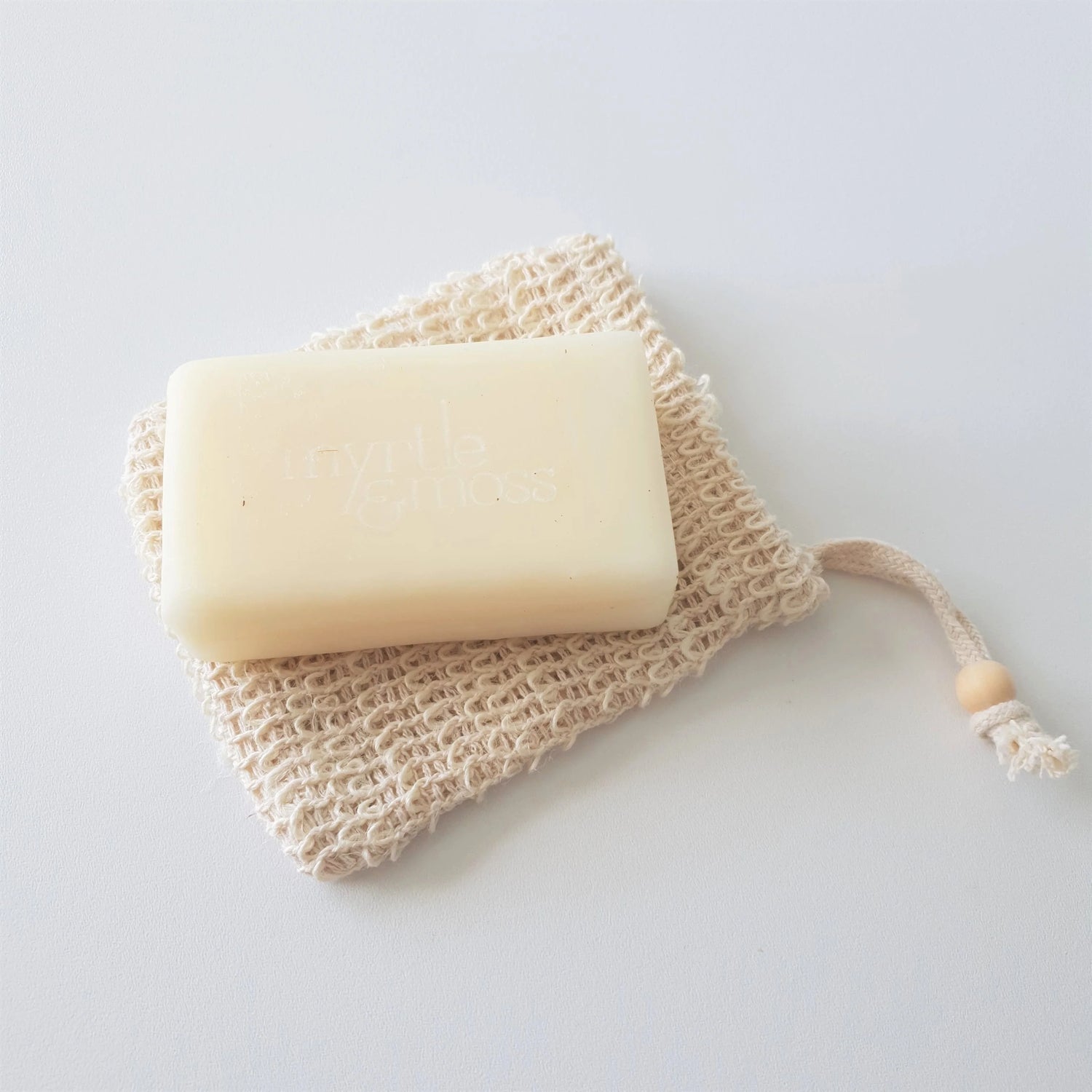 The natural hemp fabric bag is both sustainable and an ideal exfoliating tool, allowing the soap to create a generous lather whilst providing effective exfoliation of the body. The bag can be used to store the soap bar or placed over the hand as a mitt.