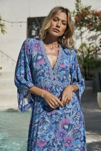 Unveiling the Lapis Empire Dress from Nine Lives Bazaar's Nostalgia collection - a striking piece inspired by eras past. Get swept away by its effortless charm and timeless appeal. This versatile dress is truly a wardrobe staple, featuring 3/4 bell sleeves, custom brass deco buttons, and a chic side seam slit for added flair. The relaxed silhouette ensures both comfort and elegance, perfect for dressing up or down for any occasion. From special events to casual outings, the Empire Dress is sure to make a statement. With practicality and sustainability in mind, this dress is also ideal for breastfeeding and accommodating a growing bump. And with its intricate print placement, it exudes sophistication and is a must-have addition to any collection. Made from 100% Lenzing™ Ecovero™ Viscose Crepe, this dress offers eco-conscious elegance. Get ready to make heads turn in the Empire Dress!