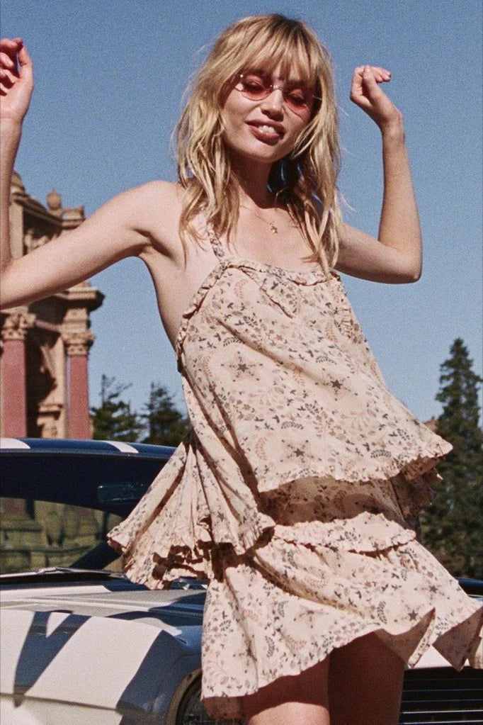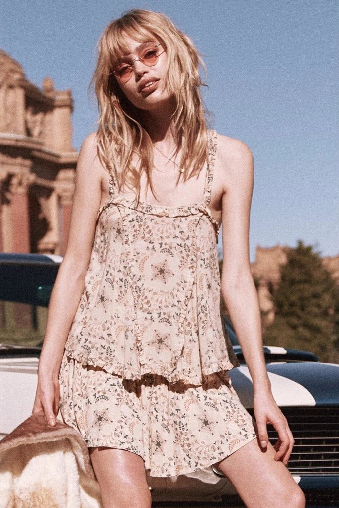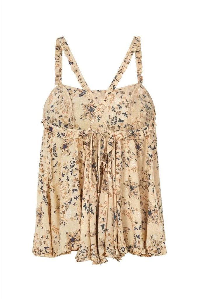 The Celestial Cami in delightful cosmic inspired cream is light and flirty and perfect for those warmer days. Cut from light and flowy fine rayon, this top is adorned with a delicate ruffle trim and a bold celestial motif in shades of cream, gold and charcoal. Make use of its low tie back to determine just how much skin you want to show.
