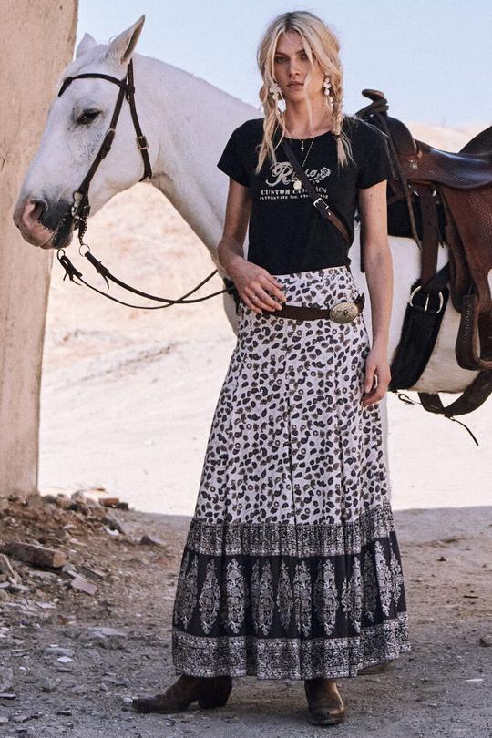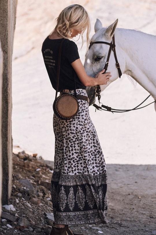 The Delirium Maxi Skirt is both understated and distinctive, in a muted leopard print intertwined with water vines and elephants motifs.