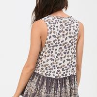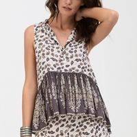 A simple, easy wear top that pairs with almost anything.  The Delirium Top by Spell  features a loose fit, T-back and button-down neckline. In soft hues of pale slate and cream giving the impression of floral-like leopard print.