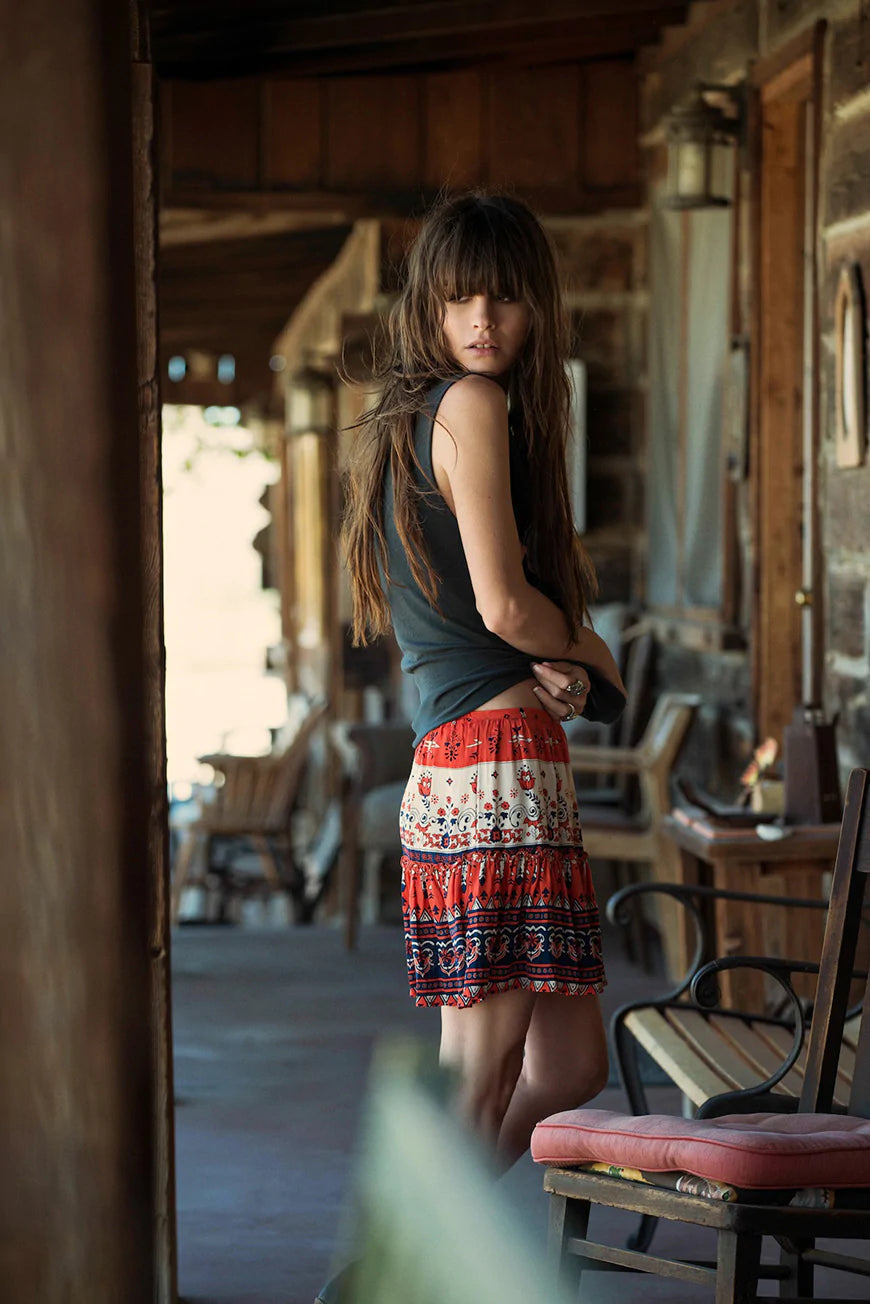 Desert Wanderer Collection 2013Gorgeous mini skirt in sunset. Vintage Spell from 2013 with signature skull and feather designs, pair with your fav cowboy boots. 100% Rayon Elasticized waist with drawstring closure. Flounced hem.