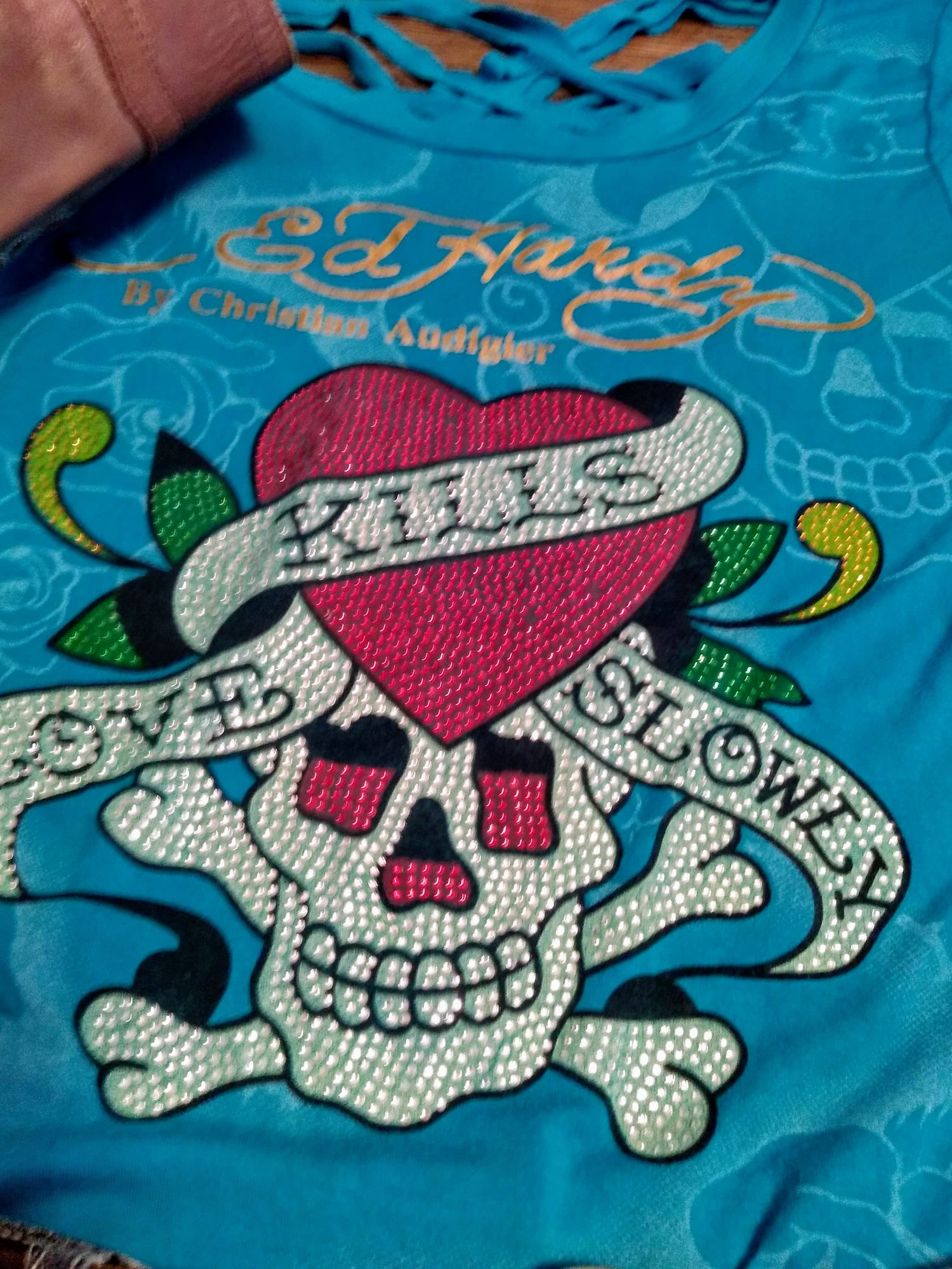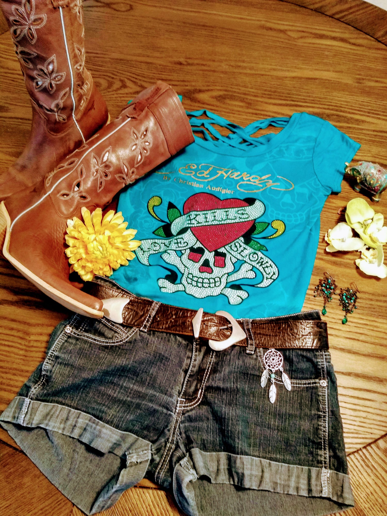Embellished sequined tattoo design in "Love Kills Slowly" this funky tee pairs well with denim rocker shorts or jeans and your fav cowgirl boots