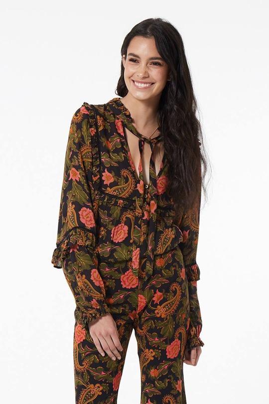 The blouse flows down to the hips and has another frill to finish it off at the bottom. Such a beautiful blouse in signature Etienne Print, inspired by chic Parisian style with flourishes of old worldly elegance. Pair it with denim flares or the matching Etienne Pants or Skirt.