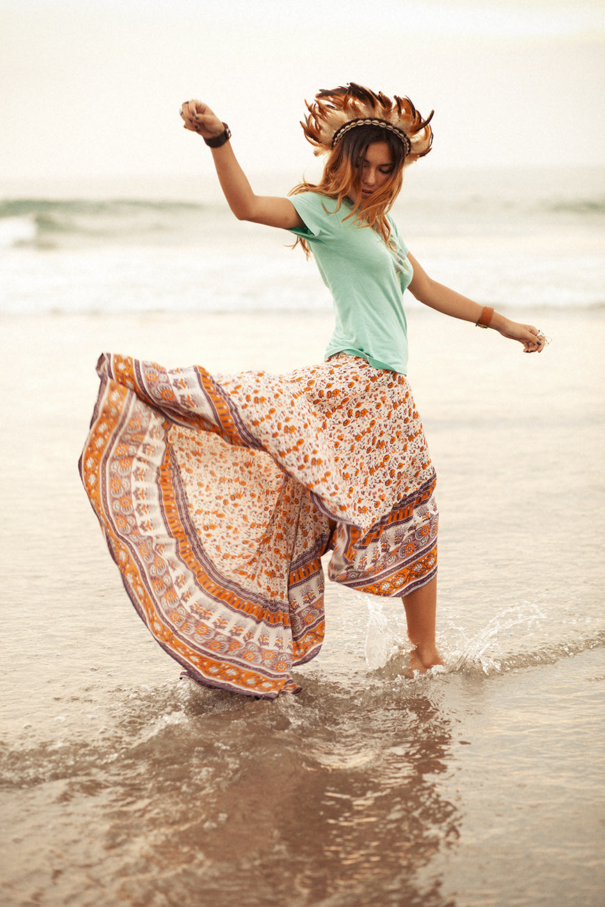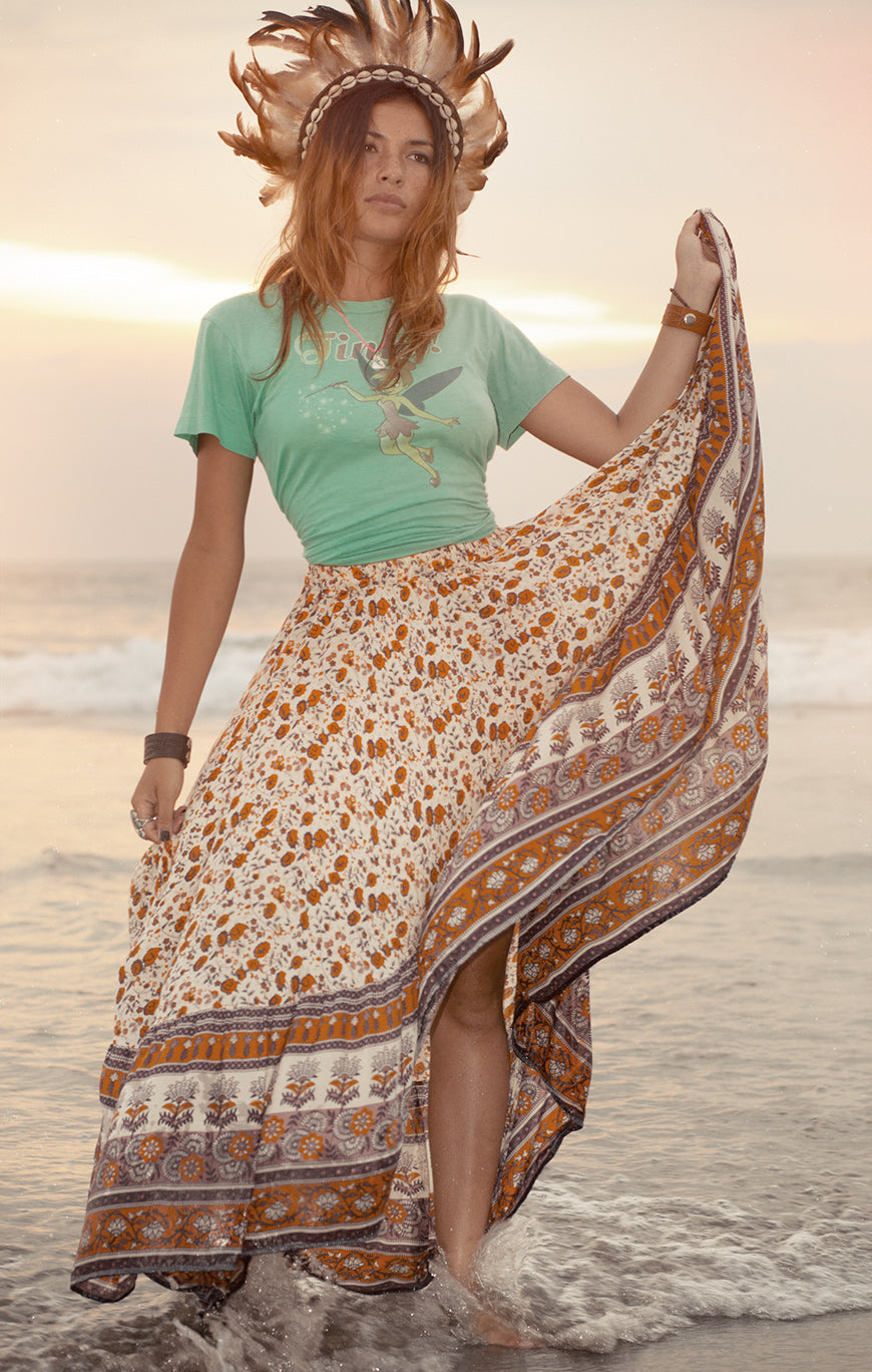 Features Gypsy Love ~ The gorgeous first ever hand drawn print from Spell the "Gypsy Love" in the Castaway Skirt in Orange Blossom from the original Never Never Land drop in 2012