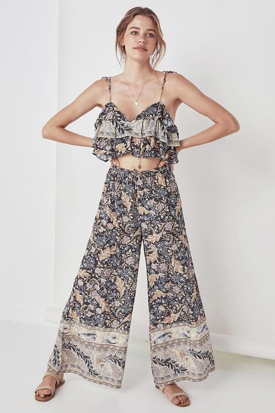 Heavenly Oasis Palazzo Pants in nightshade, a striking placement print! Featuring a drawstring elastic waistband and finished with antique brass beads, this easy-wear pant is dazzling.