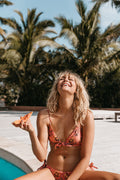 Spell’s adorable Posy Knot Cheeky Pant in peach with its chic knot ties at the side is a feminine, medium coverage swim style.