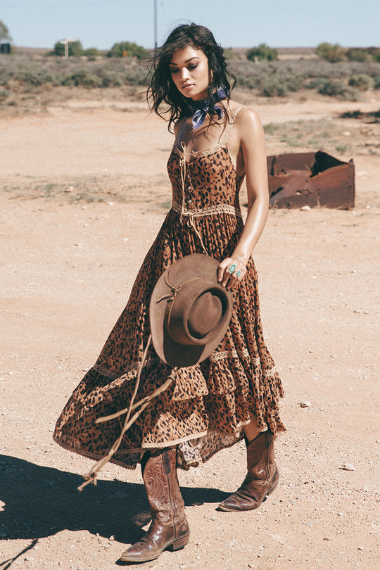 This signature Spell leopard print gown has full flowing tiers of soft fabric separated by gorgeous intricate crochet lace.