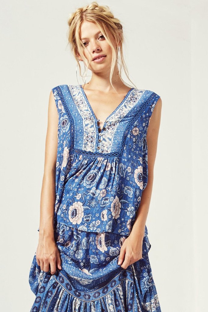 Reminiscent of the bestselling Oracle Sleeveless Blouse, the Zahara Sleeveless Blouse falls beautifully with a pinafore style top and buttons at the bust to wear it a little more open if you like, flowing down to the hips freely in light rayon with lurex.