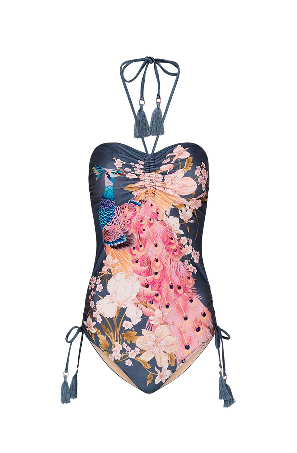 Oversized blooms and peacocks, coupled with ruched details, delicate swim tassels in a lively colour palette, create a mood of languid opulence that will certainly set you up for some chic, resort lounging or touch of seaside sass.